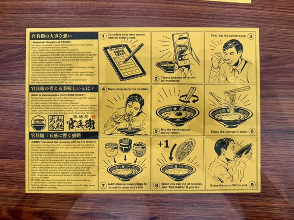 Found this very nice ramen place called Kanbe Ramen. They had instructions on how to eat ramen and a little drum to call for service. Great job and interesting things.